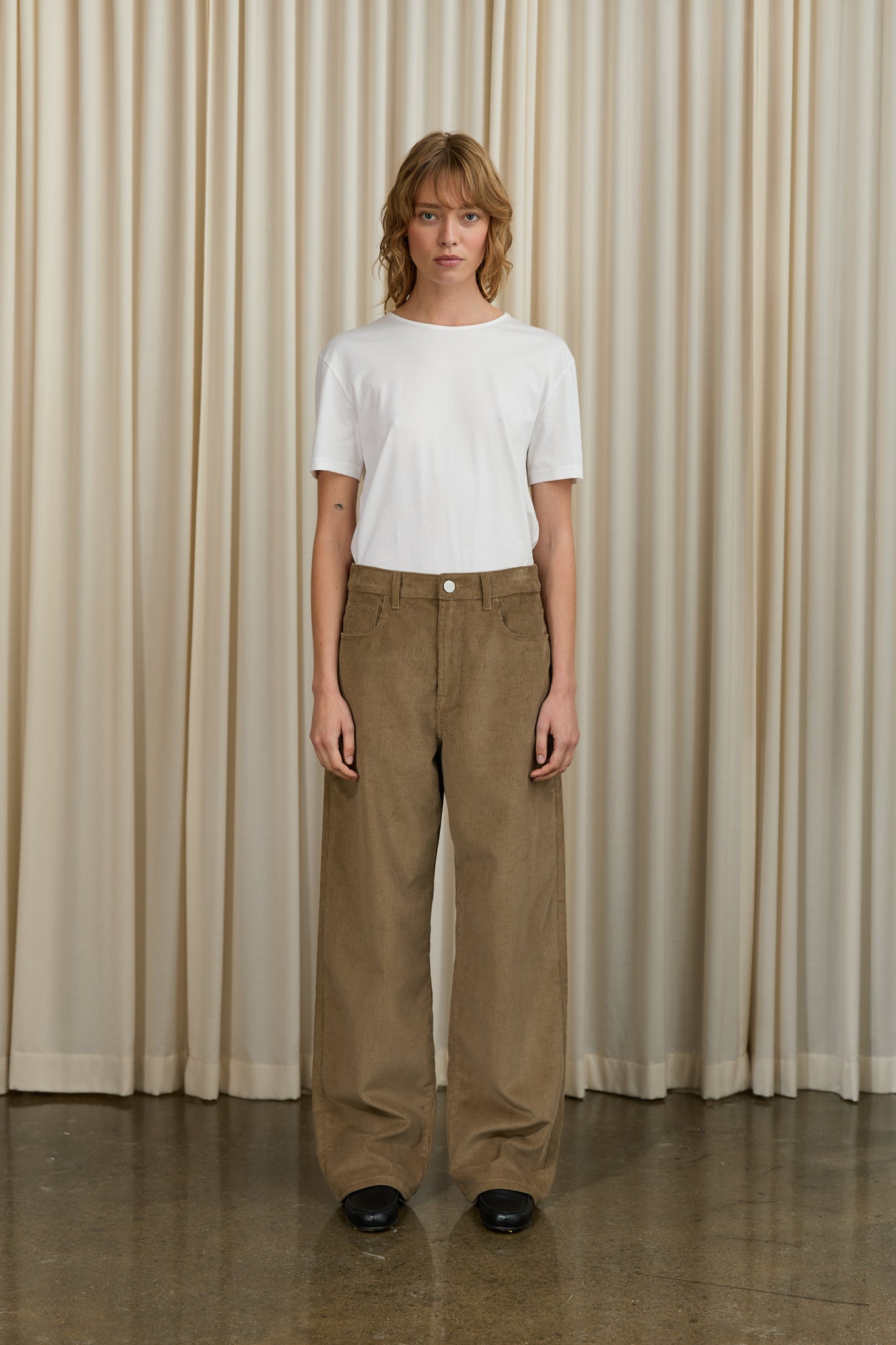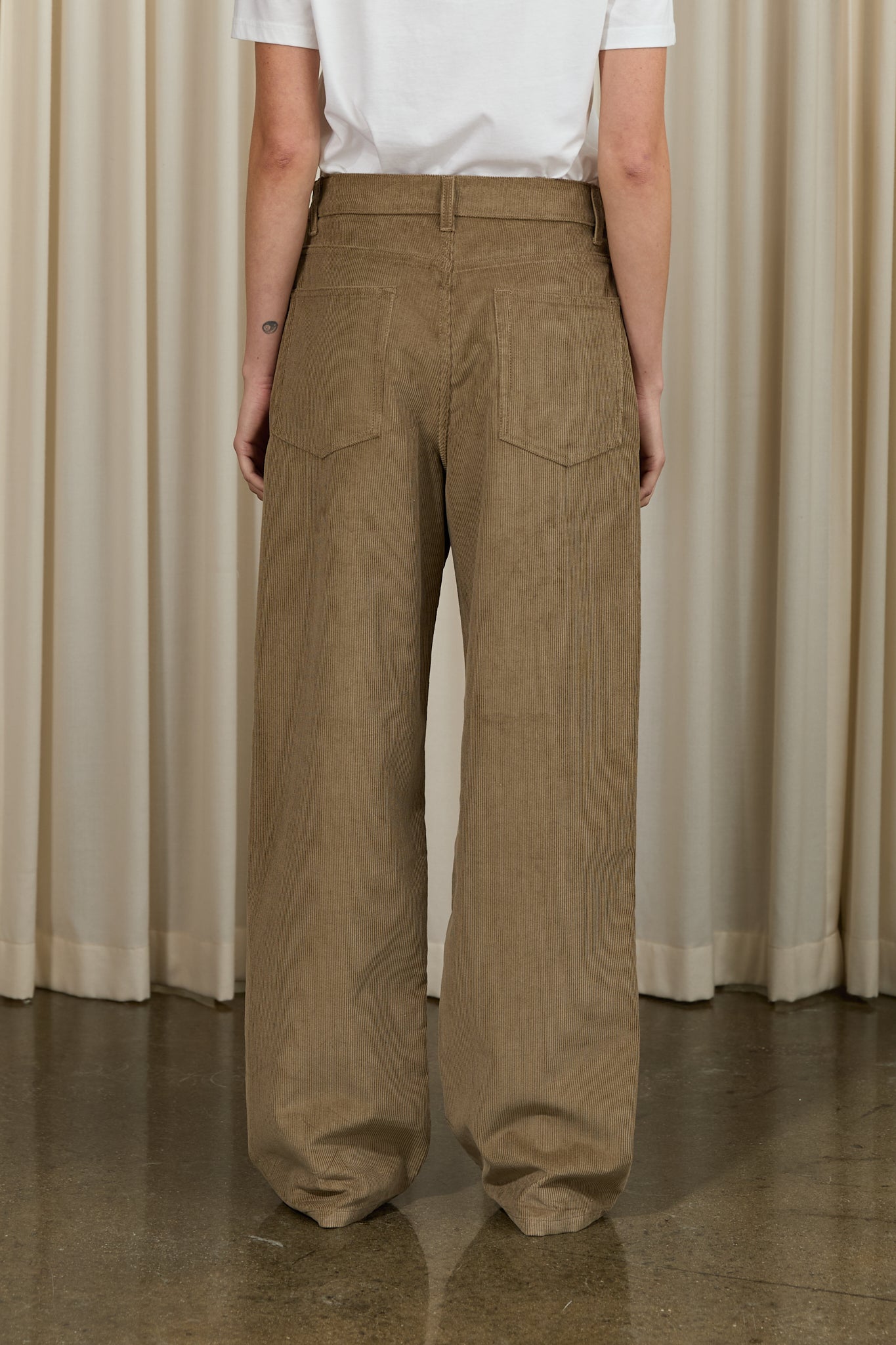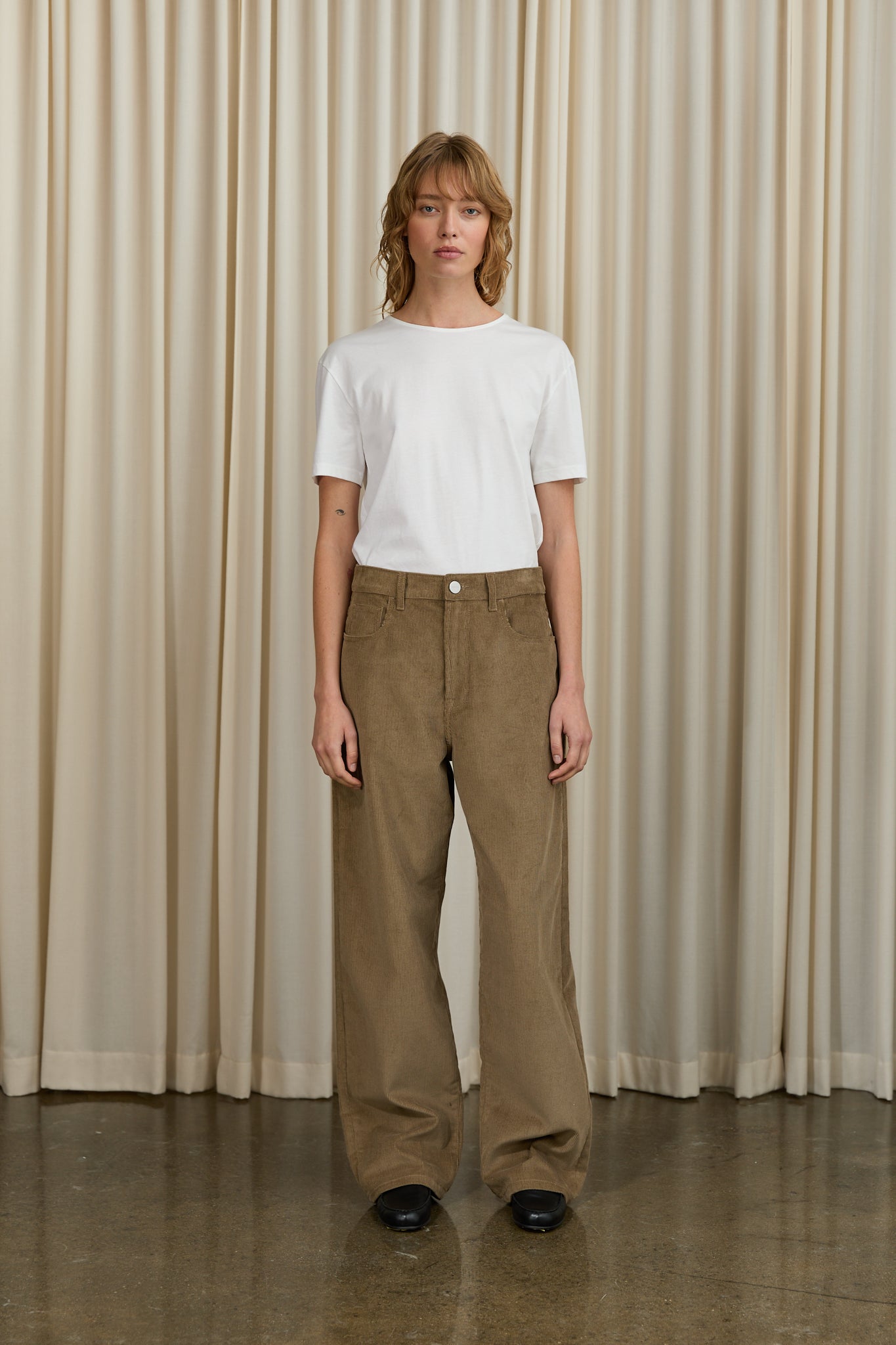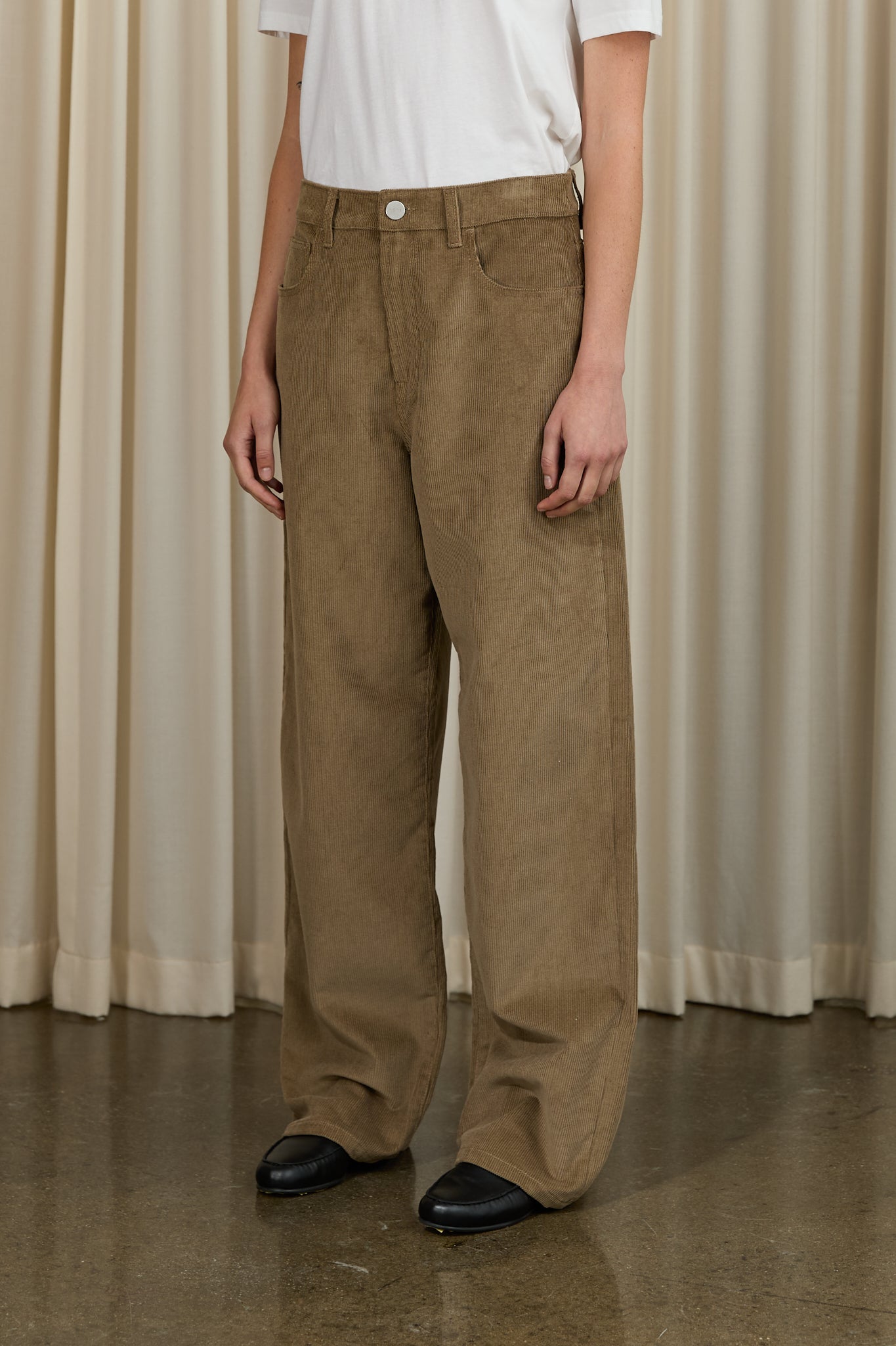 Corduroy trousers in denim-inspired 5-pocket style. Features tonal topstitching, belt loops and button fly closure.